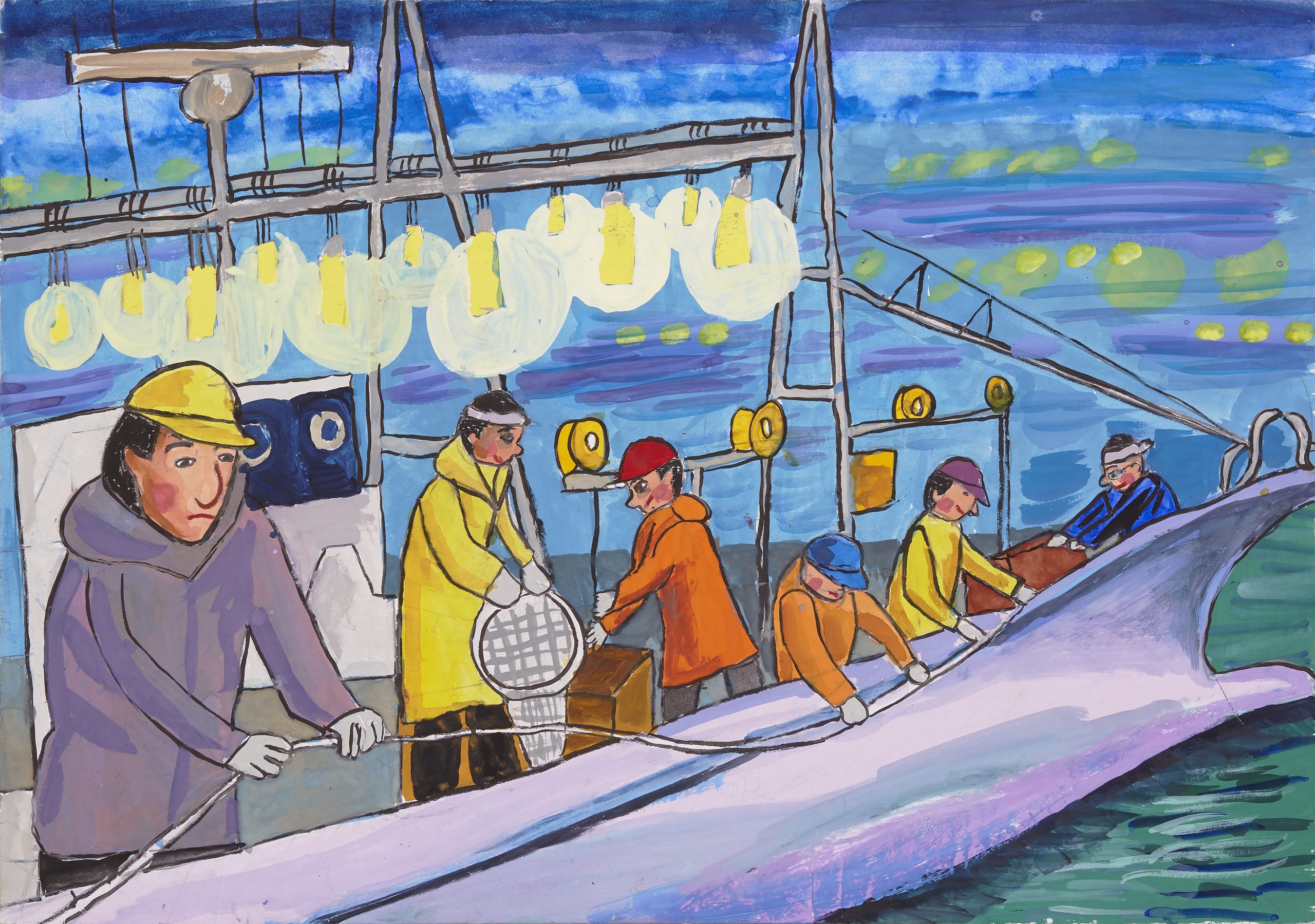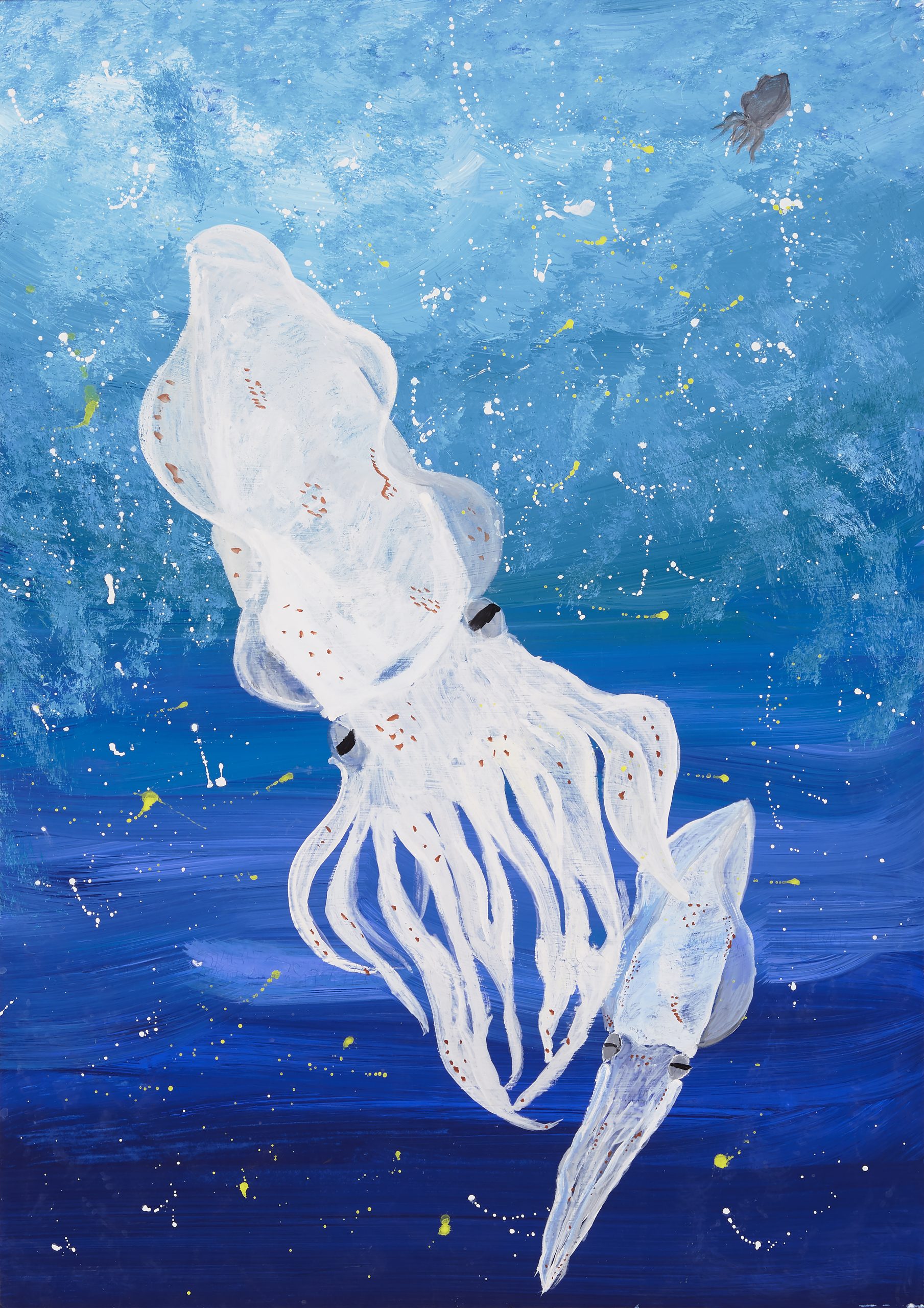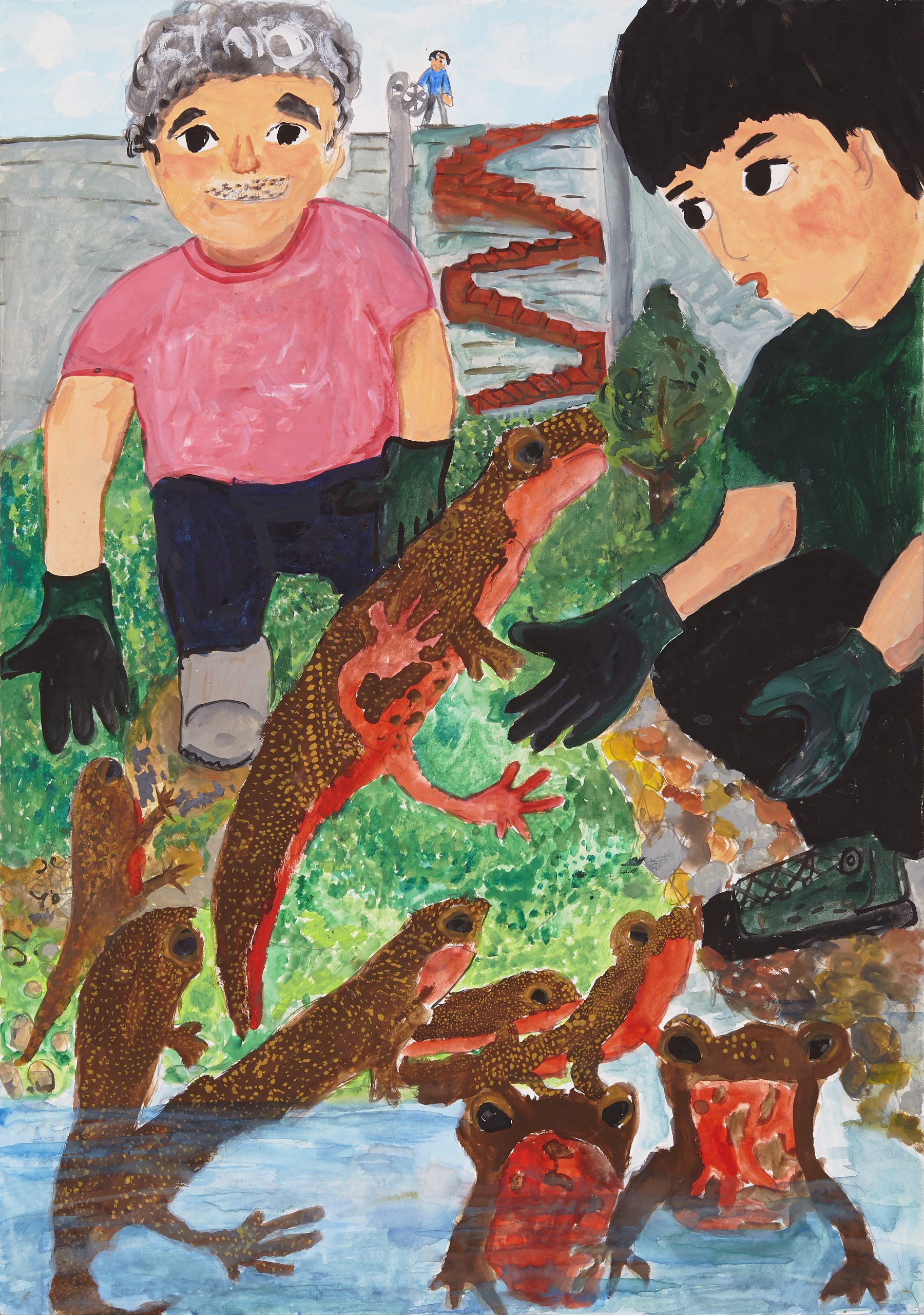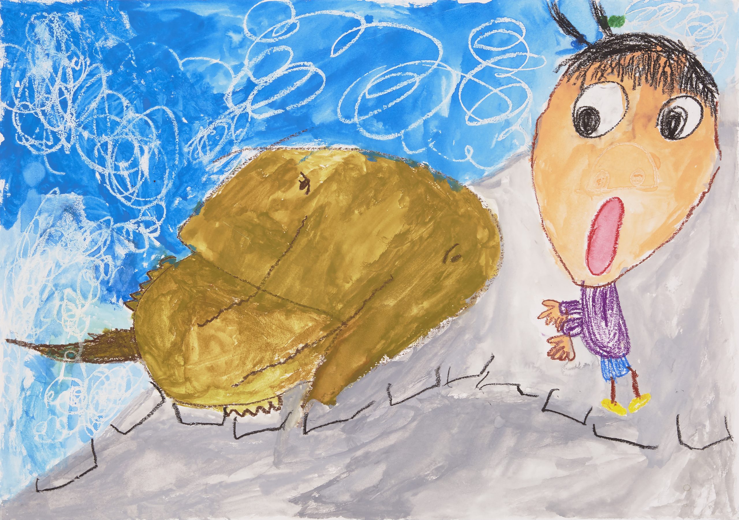 どれも素晴らしい作品でしたが、まず目を惹かれ印象に残ったのがこの絵に描かれているお子さんの表情でした。博物館でカブトガニを見た後に海岸を散歩していたという状況下のなかで、“本当にカブトガニがいた!”という言葉がこの作品から聞こえてくるようです。また、お子さんの“びっくりした”という心情が描かれたカブトガニの大きさから伝わってくるようで、本当に素晴らしい作品だと思いました。