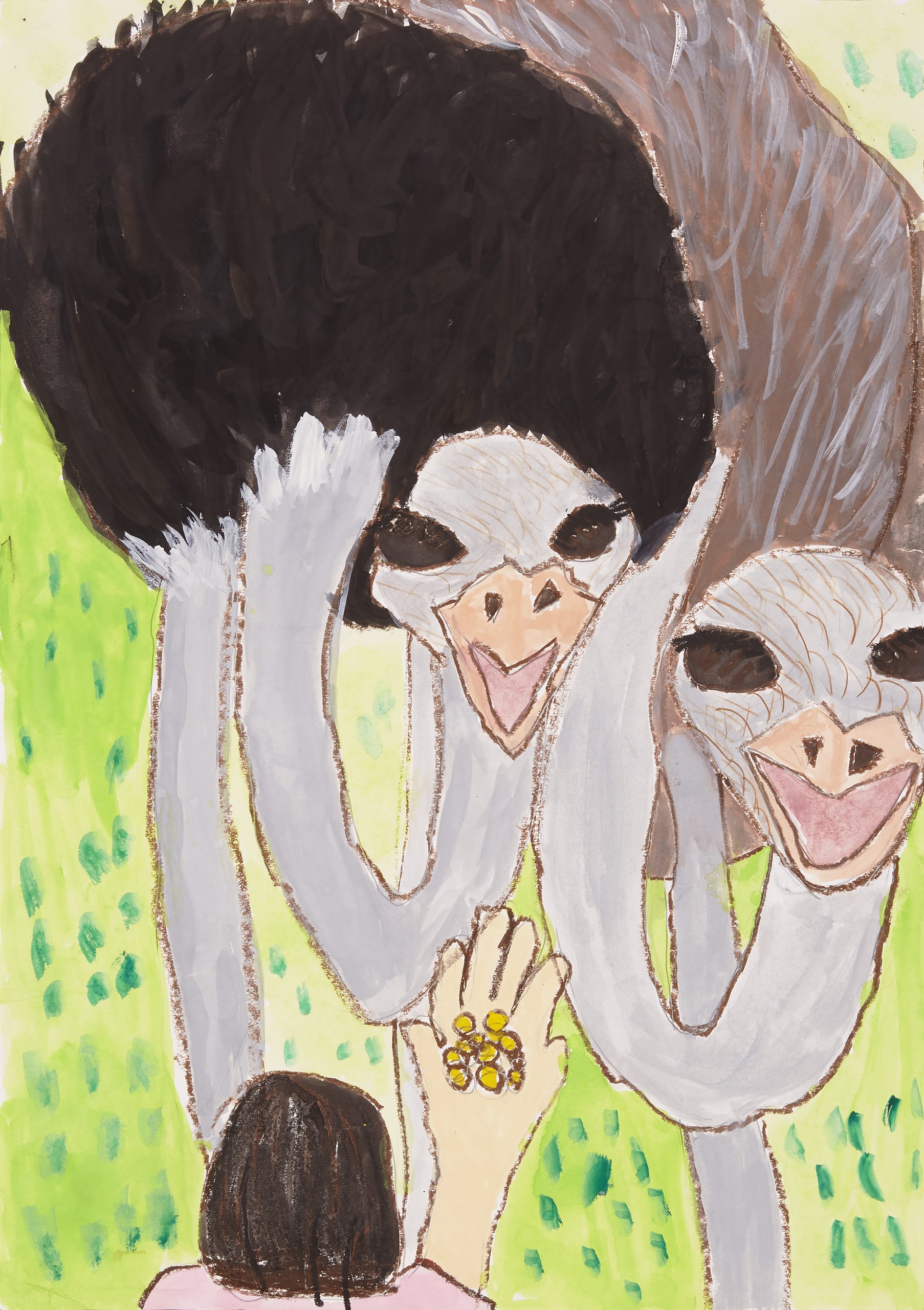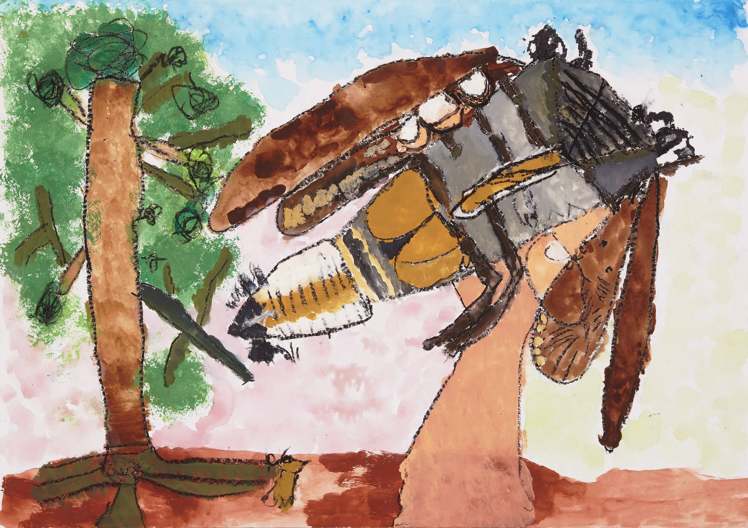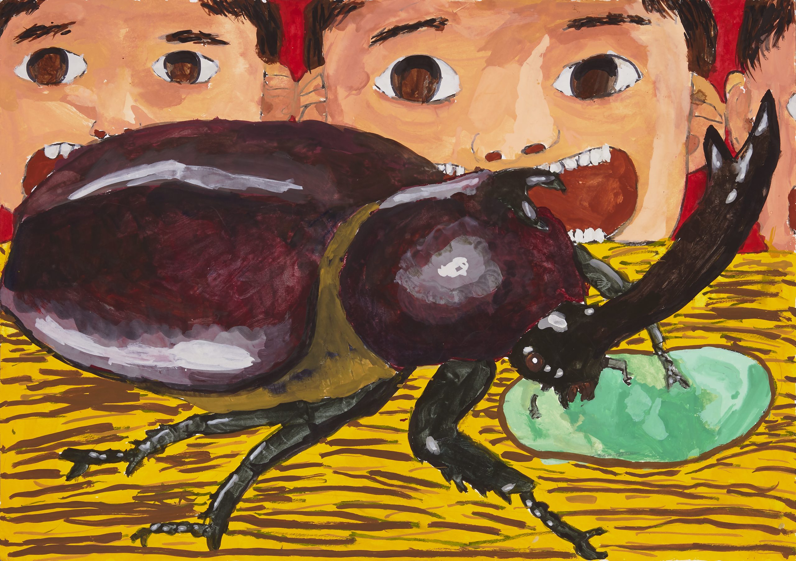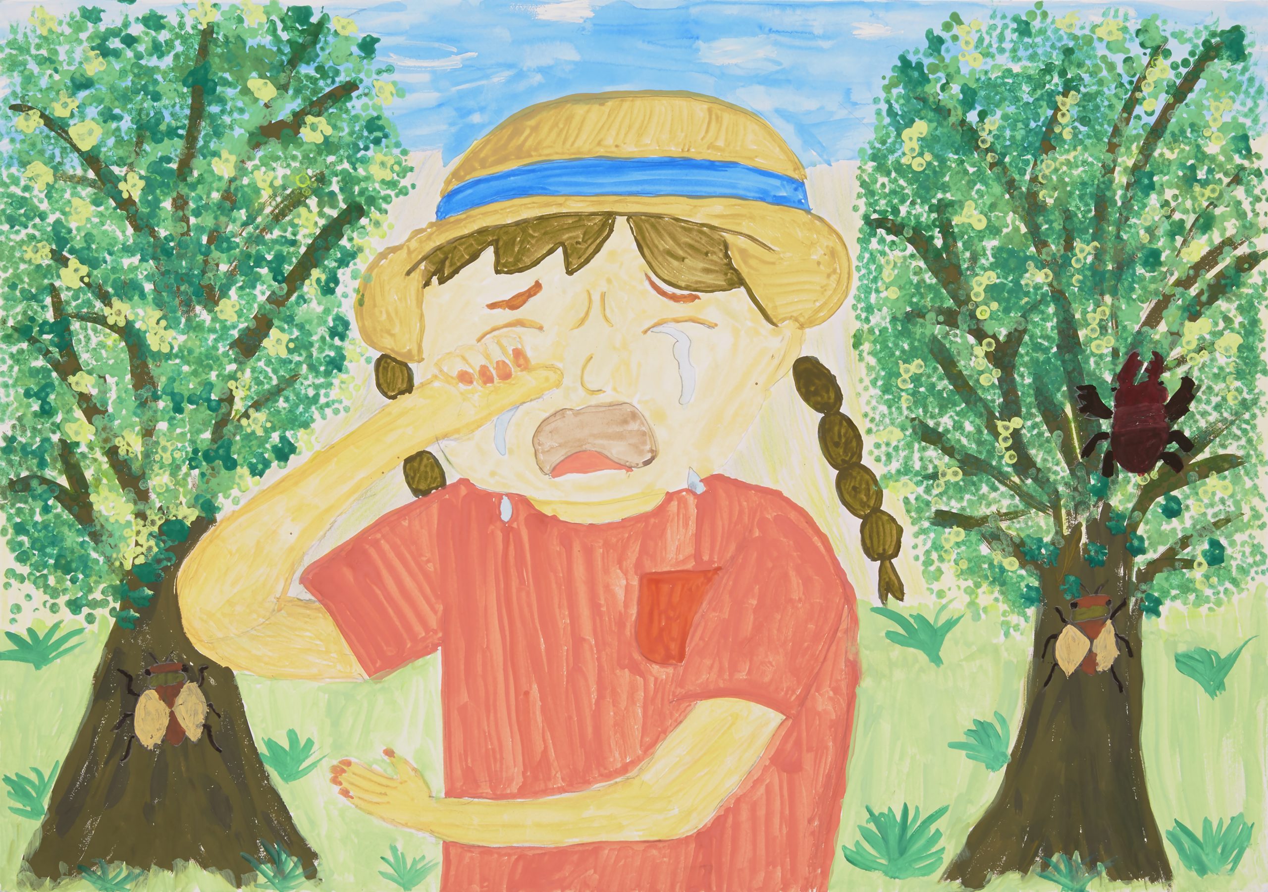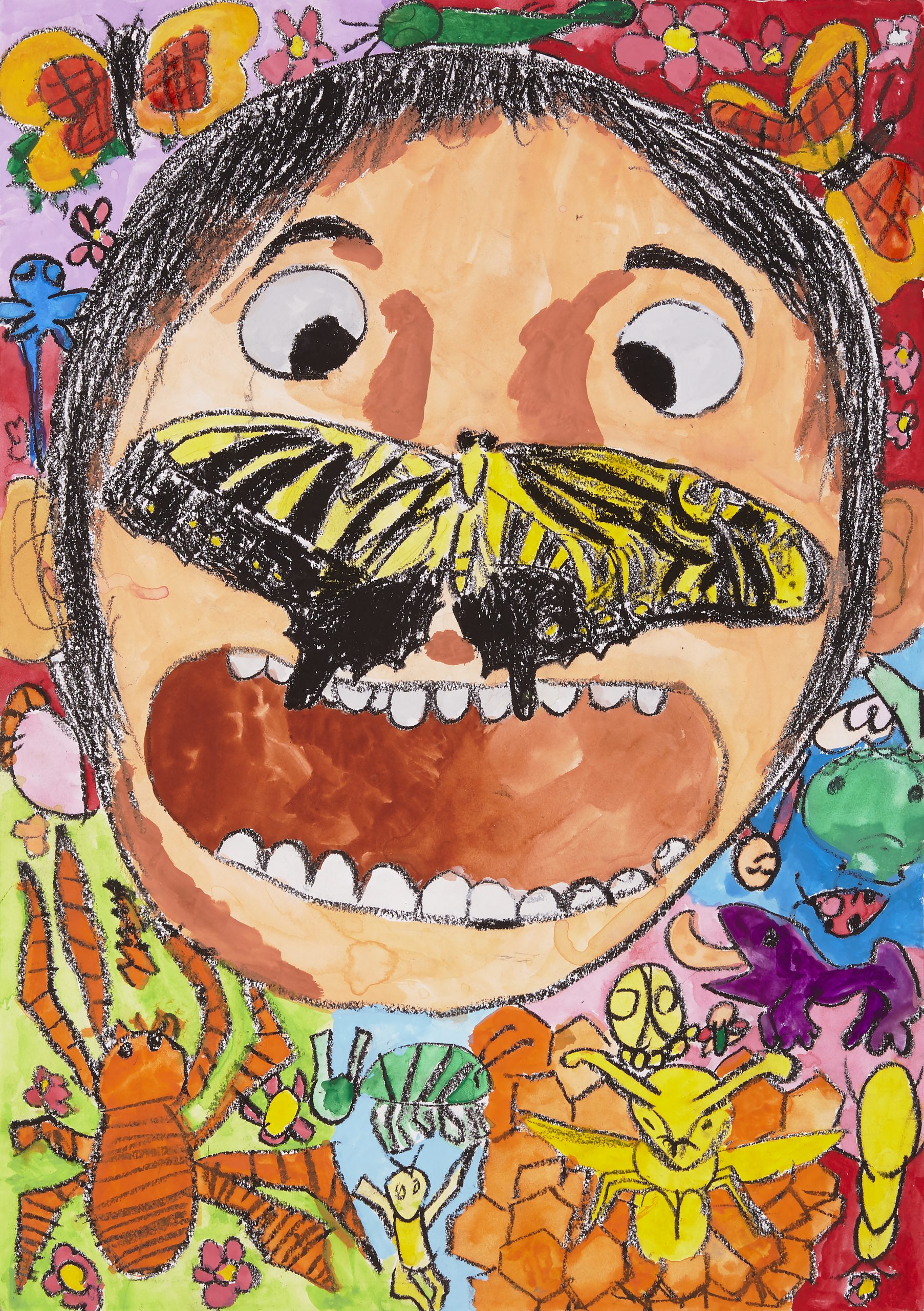 楽しいことを描いた作品が多いのですが、これは唯一怖くて泣いている作品であったためとても印象に残りました。本当に虫が嫌いなんだということがよく伝わってきます。昔は当たり前のように身の回りに虫がいて、怖いという感覚の前に親しみが生まれたものですが、今はその体感がないため怖くなってしまうのだと思います。このお子さんには、ぜひこの賞を機会に虫を好きになってほしいと思います。