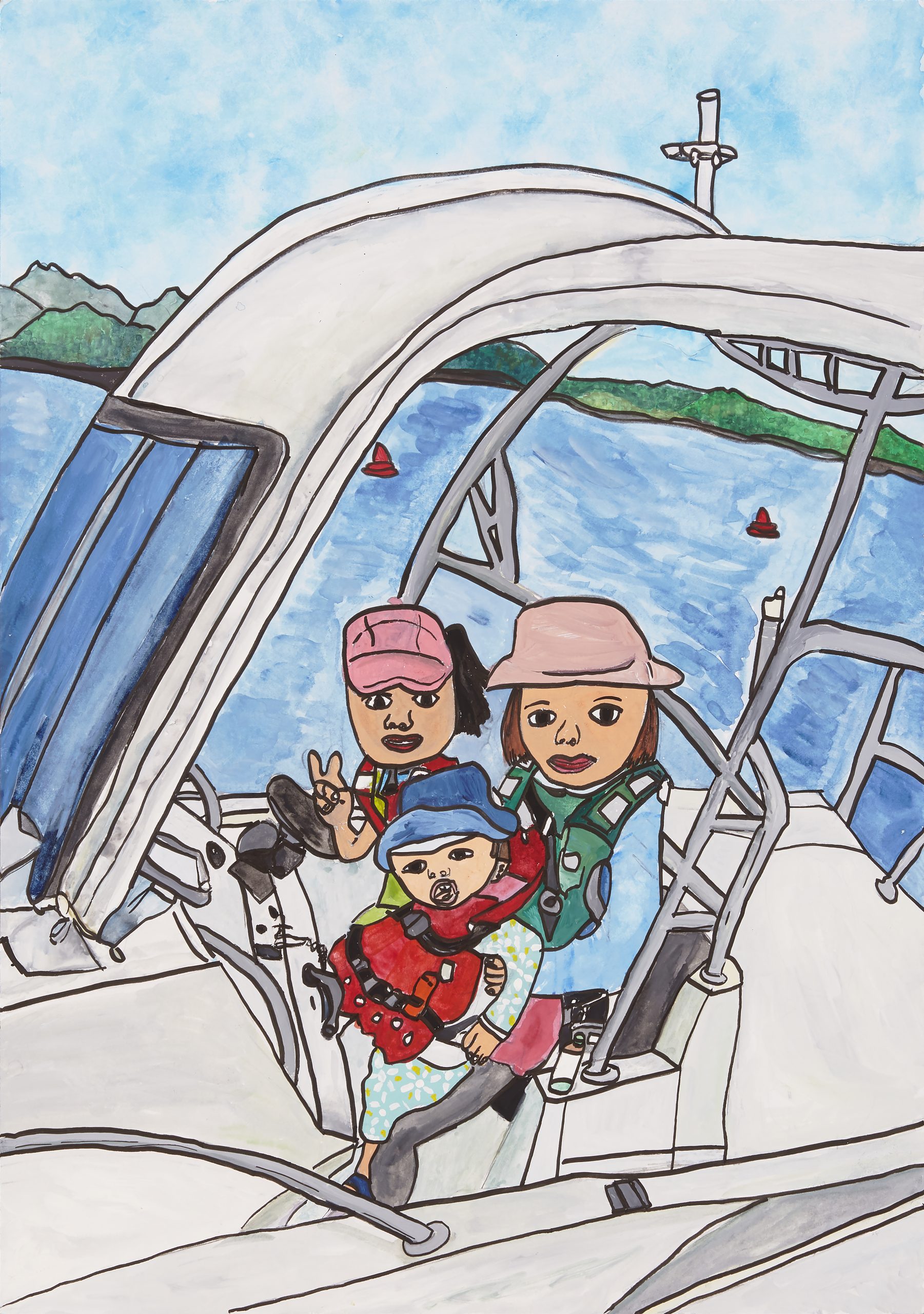 昨今は室内で遊ぶ子どもたちが多い中で、外に出て太陽の下で遊んでほしいものですが、まさにこの作品は海岸に家族が集まって明るい太陽の下で楽しんでいる作品です。ゆくゆくはこのビーチからマリーナへ、そして海上に出て遊んでいただきたいという思いを込めてこの作品を選びました。