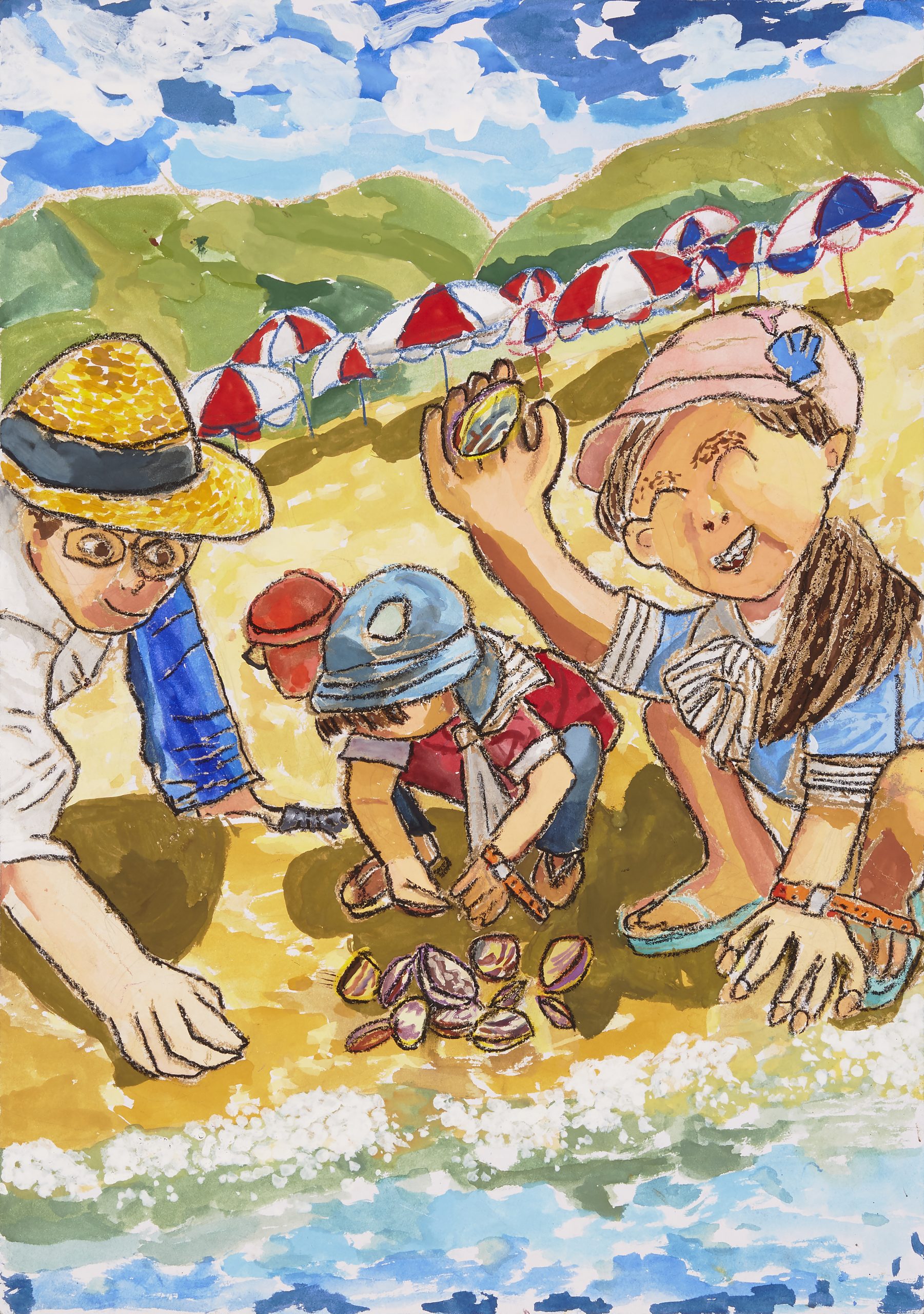 家の近くのすま海がんで家ぞくと、しおひがりをしました。たからさがしみたいで、すごく楽しかったです。弟ときょうそうをして、たくさん見つけました。見つけたアサリは、家でパスタやスープにして食べました。また、しおひがりに行けたらいいなと思っています。
