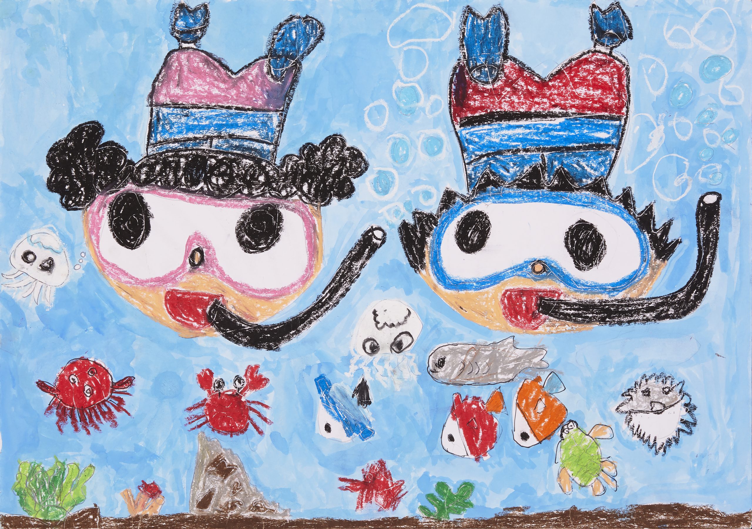 苦手だったセミを田舎に帰省した時に何度も触れたことで大好きになったという作品です。セミを手に持って近くでじっくり観察して、画用紙に大きく、かつ細かいところまでしっかり描かれています。このセミを格好いいと思う気持ちがとてもよく伝わってきました。大好きなものが一つ増えたこの自然体験をきっかけに、これからもさまざまな挑戦や出会いを楽しんでほしいと思います。