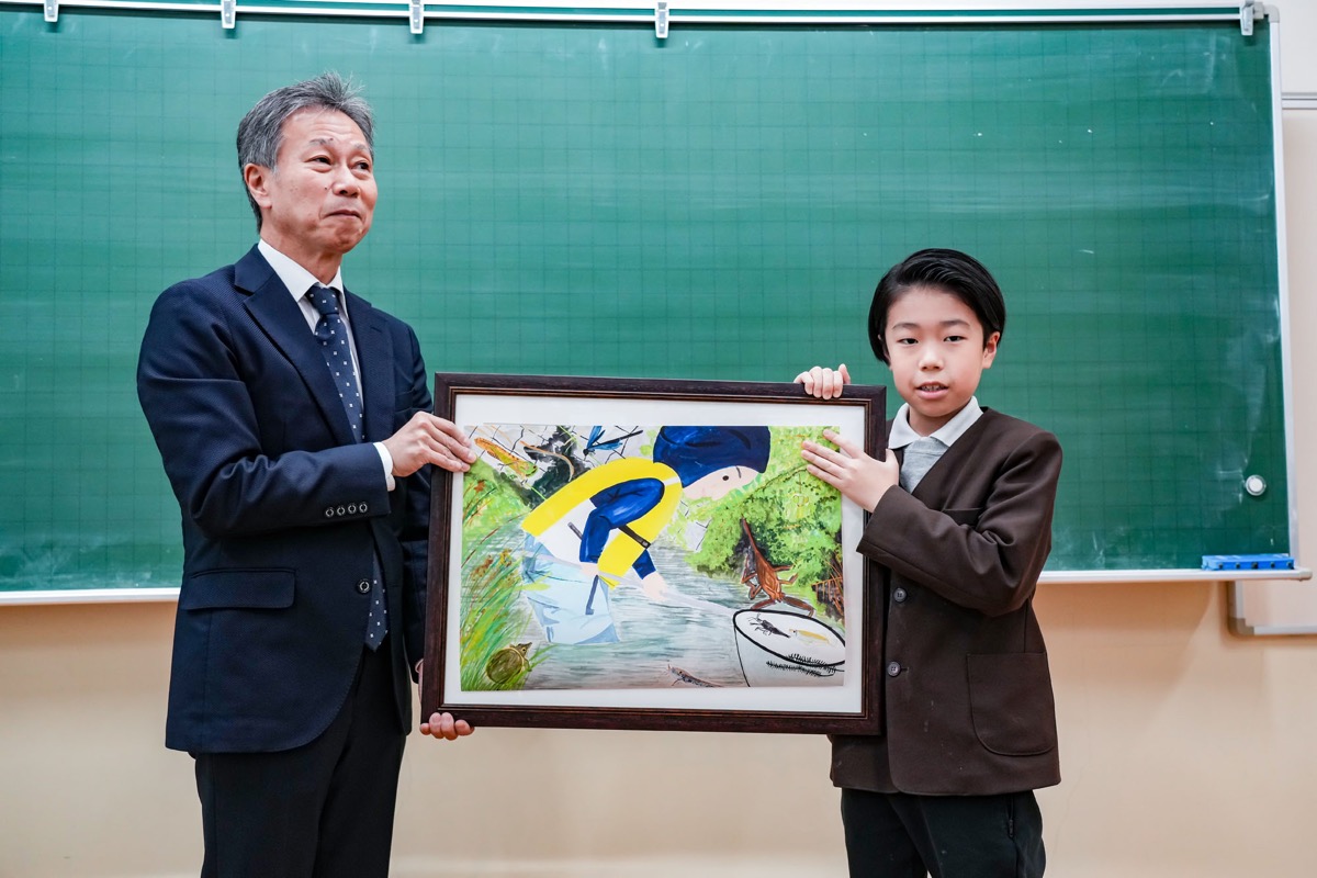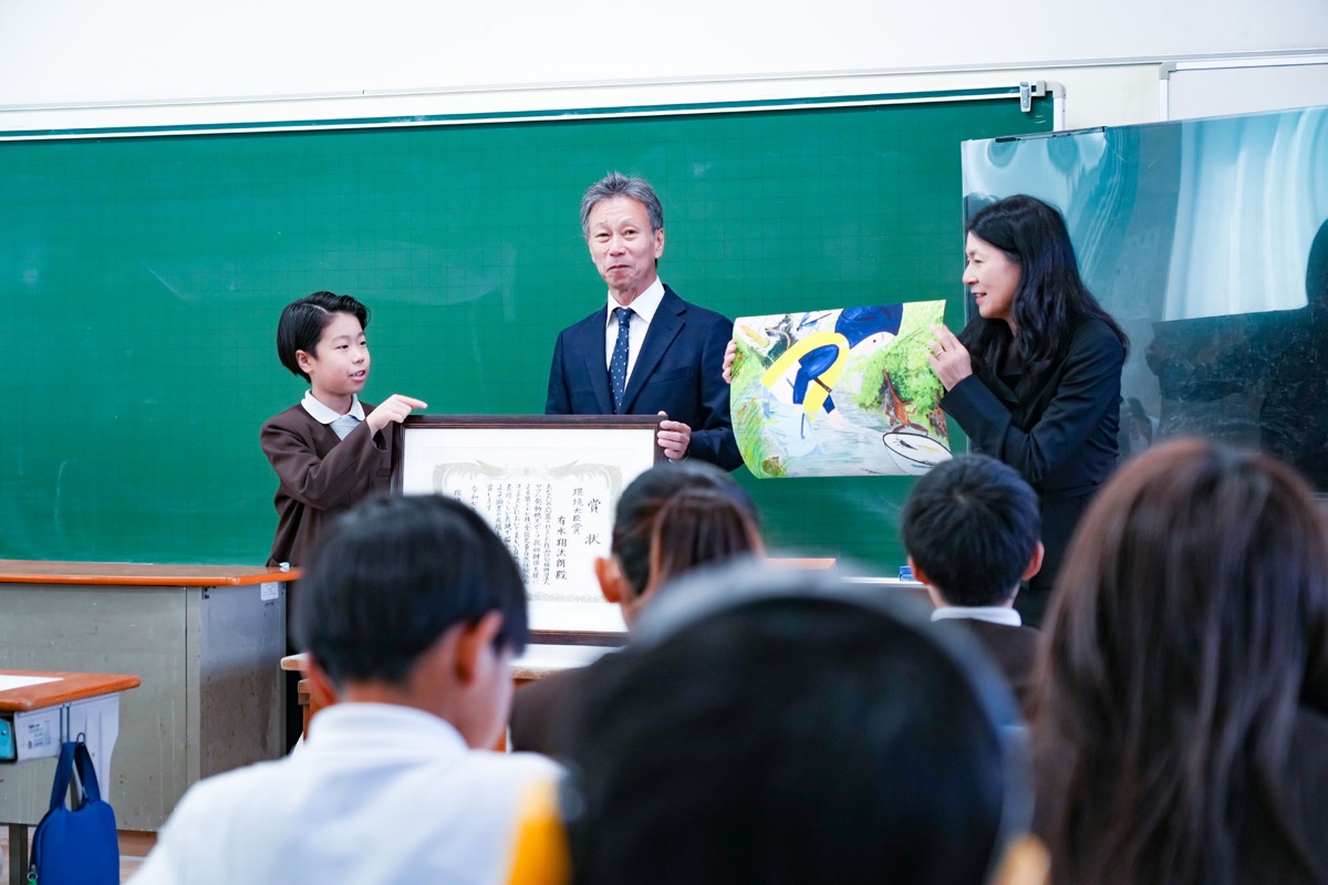 2025年12月17日(水)、環境大臣賞を受賞した有水翔汰朗さんの表彰式を本人が通う小学校のリモート全校朝礼で行い、当財団の常務理事 河邊幸司より表彰状を贈呈しました。