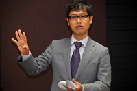 スポーツでは、常に環境が変動するが、こうした中で、いかに正確にプレーを続けるかは重要なテーマである。なかでも繊細なプレーは、プレー中の柔軟な対応が必要になるが、それを実現するのは、目や関節の感覚などのセンサーと、それを処理する脳神経系の仕組みだと考えられる。一方、直接、感覚刺激が身体の動きを引き起こすと言われているが、これまでは注目されていなかった。ところがボールを投げる動作のように、身体の動きの多くは無意識に行われ、その無意識の制御が実際のパフォーマンスを決めるという側面が強いと考えている。そこで、画面にターゲットを示し、それに手を伸ばす最中にそのターゲットが動くという中で、ターゲットを追う、また逆の方向へ動かすというタスクで動作分析を行った。結果は、随意的な反応時間よりも短い時間に応答が出ており、無意識的な処理で出現する行動だと言える。また、このタスクに関しての無意識的な反応は、運動習慣の影響がないという結果が得られたため、今後は、これを参考に、感覚と動きをつなぐ新しい身体運動科学を構築したい。