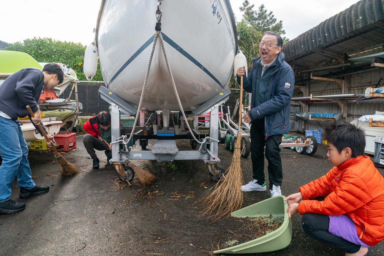 今年も葉山マリーナのクルーザーによるクルージングを行う予定でしたが、あいにく日本海で発生した大型低気圧によって吹き込む南風の影響でこの日の相模湾は大時化となってしまい、クルーザーの出航が中止となってしまいました。普通なら楽しみにしていたイベントが中止になってしまったらガッカリと落ち込むところですが、普段から海と付き合っている生徒たちは慣れたもので、早々に気持ちを切り替えて、箒を持ってハーバーの大掃除に精を出しました。