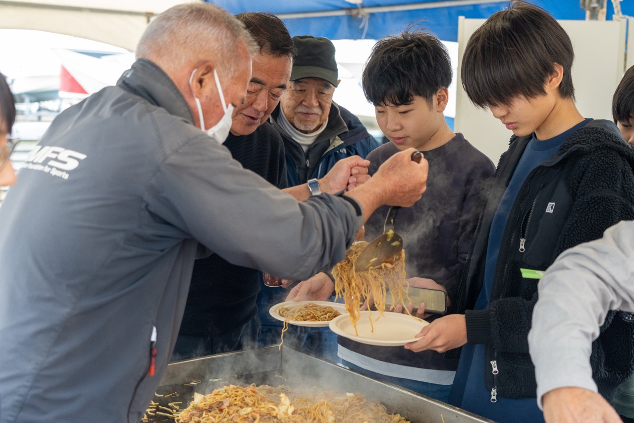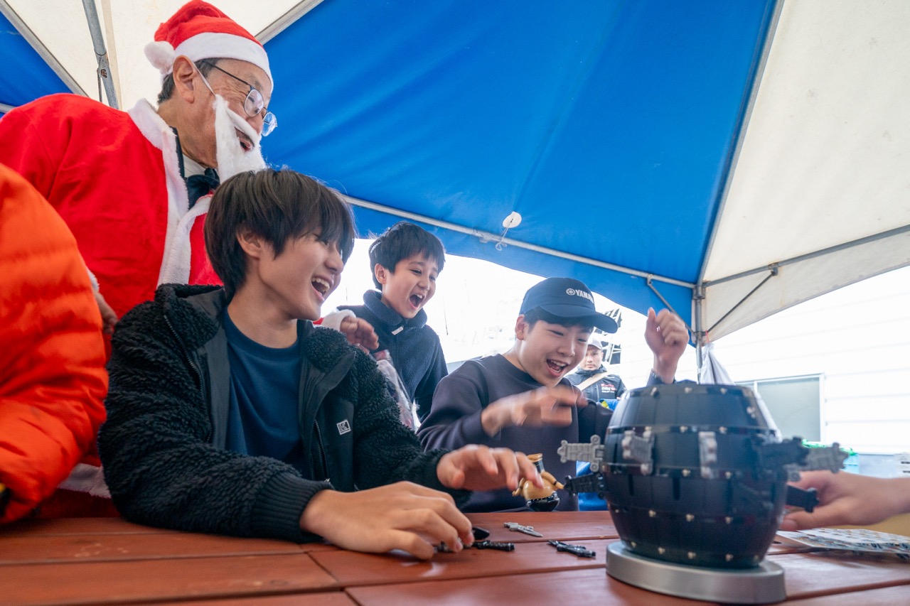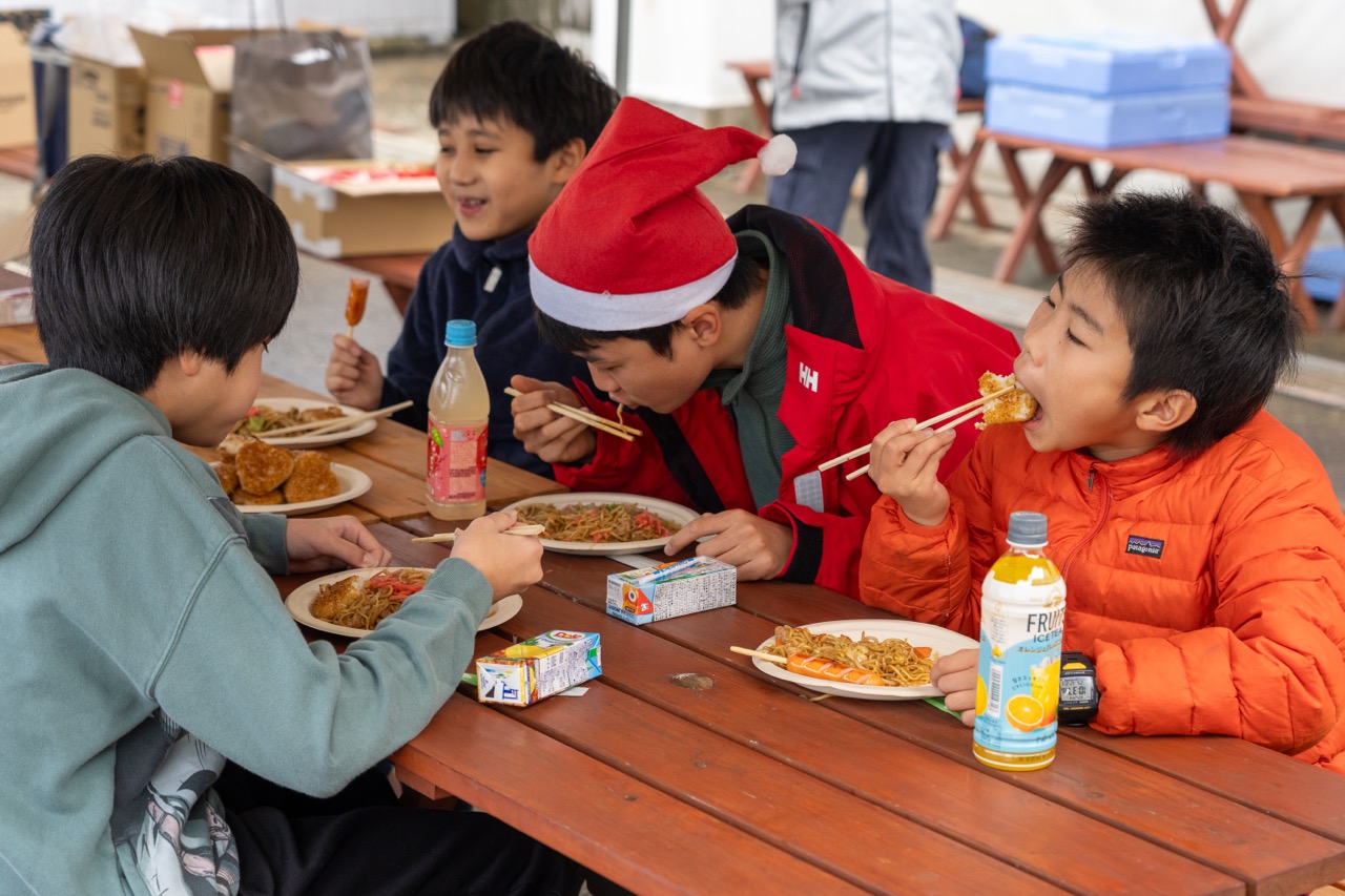 最期の大仕事を終えた後はお楽しみのバーベキュー。コーチたちが腕によりを掛けたヤキソバや焼き肉を我先にと皿に盛って美味しそうに頬張ります。お腹がいっぱいになったら豪華クリスマスプレゼントが当たるビンゴ大会! サンタクロースに扮したコーチの呼び上げる番号に一喜一憂です。