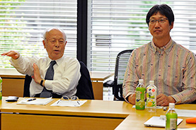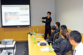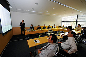 午後は永見さんからスタート。第3期生時代に取り組んでいた「野球の投球ボールの特性」の研究を踏まえ、新たに取り組んでいる「変化球の回転軸の特徴」について報告がありました。続く樋口さんも、従来取り組んでいた「野球打撃前のウォーミングアップ法」の研究をさらに進化させ、「視認能力」に焦点をあてた研究の進捗を話してもらいました。稲葉さんからは「アスリートが素早い動きをする場合の身体重心と足圧中心点との差異」についての報告がありました。