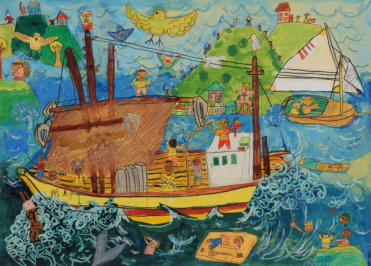 この賞に相応しい船が中心となった作品ですが、人物の多様な姿を含め印象的な作品になっています。特に私が注目したのが船を取り巻く波です。これは大人の発想ではなかなか描けない子どもらしく、またユーモアを感じさせる表現が使われており、感心させられました。