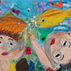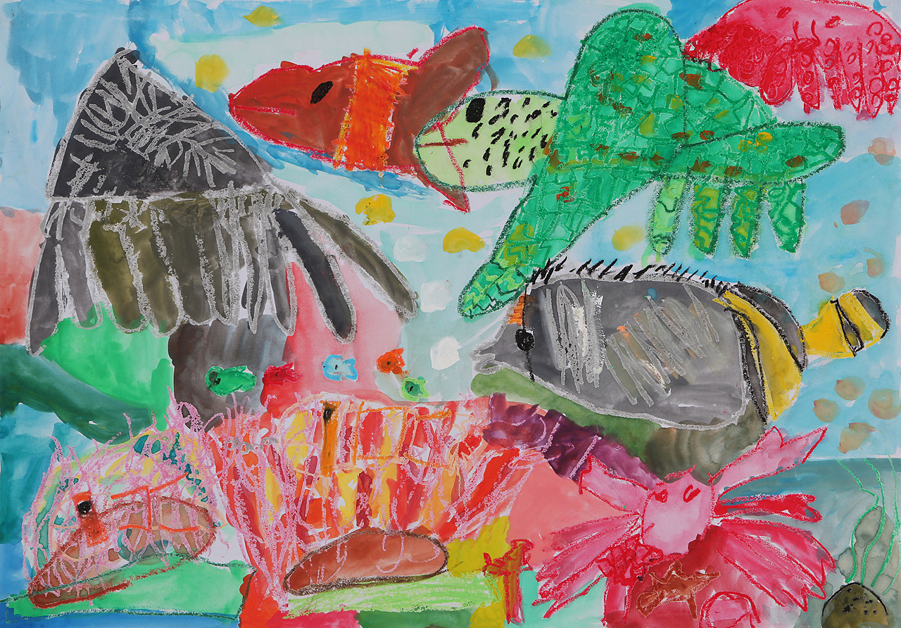 海にもぐってエサをやると、たくさんの魚が寄ってきますね。そのときの新鮮な感動の様子がよく描けています。面白かったようですね。海や水辺で経験した色いろなことを絵にしてみましょう。