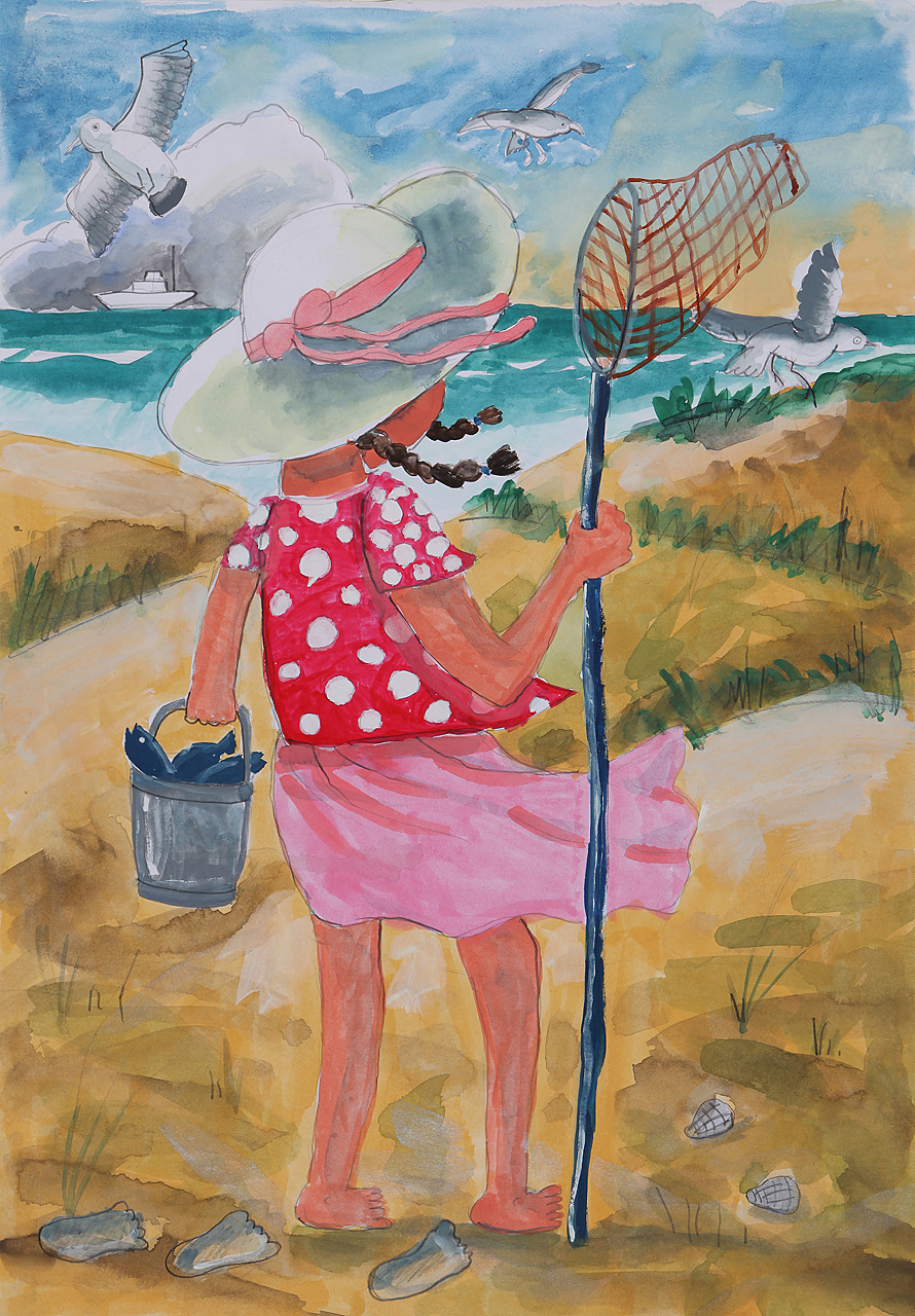 さわやかな風が吹いている砂丘を裸足で歩くととても気持ちがいいですね。カモメが“一緒に遊ぼう”と言っているような素敵な絵です。ゴミのないきれいな海を大切に守っていきたいですね。