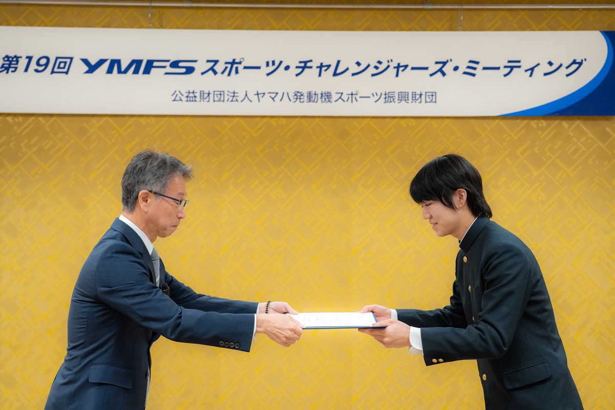 第19回YMFSスポーツ・チャレンジャーズ・ミーティングは、スポーツチャレンジ助成第20期生への贈呈式で開幕しました。第20期生一人ひとりに贈呈書の授与が行われた後、チャレンジャーを代表して清水菜乃さん(体験)が力強い決意表明を行い、31名の新たなチャレンジがスタートしました。