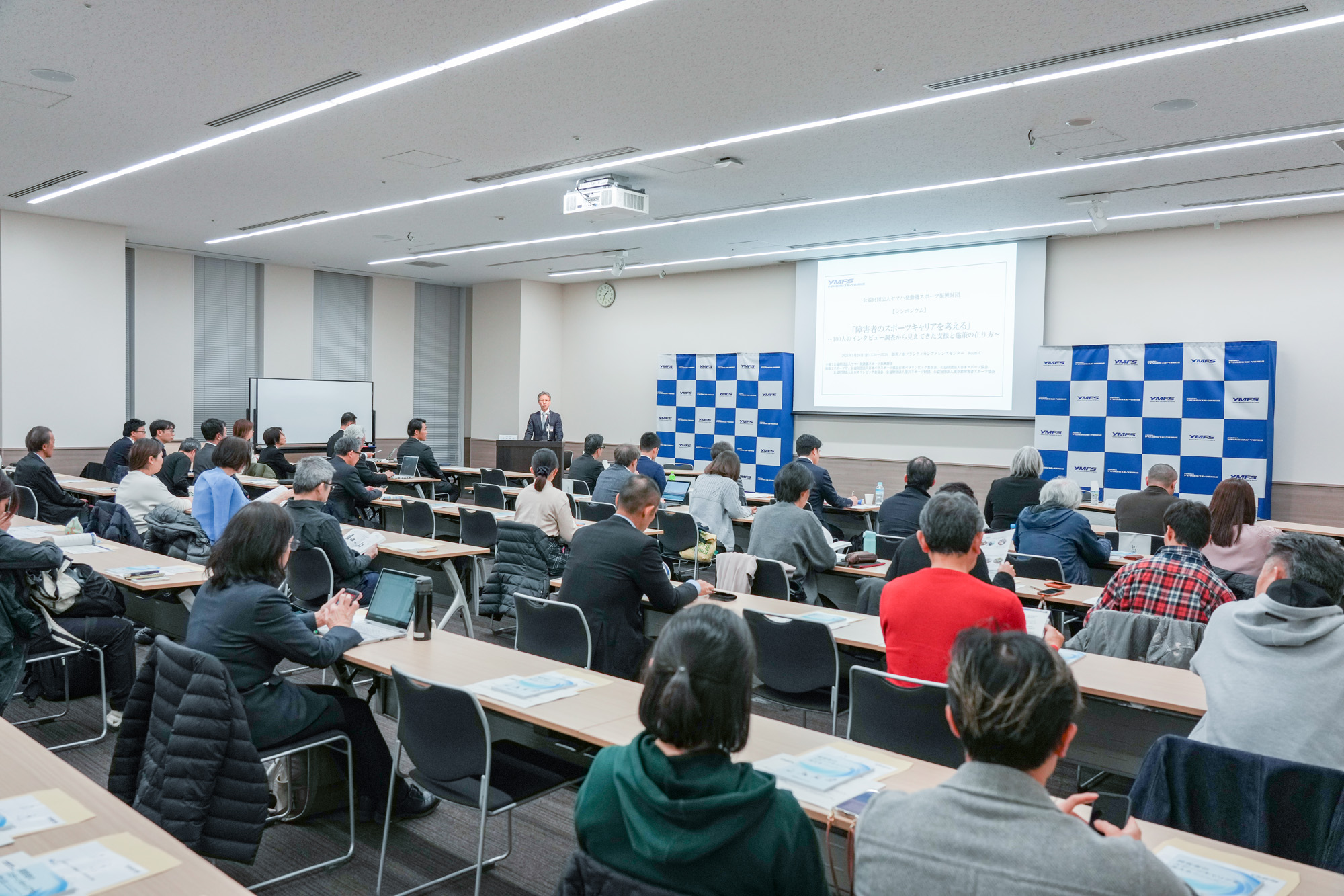 冒頭で、当財団の常務理事の河邊 幸司は、「YMFSは、2019年からはパラアスリートを中心に、100人に調査を行ってきました。スポーツとの出会い方は本当にさまざまで、まさに100人・100通りのキャリアがあり、その背景には、家族、仲間、指導者、地域など、多くの支えがあることも見えてきました。シンポジウムではこの調査から見えてきたことを共有するとともに、これから障害のある方がスポーツをはじめ、継続していくためにはどのような課題があり、課題を解決するには、どのような支援や社会の仕組みが必要なのかを一緒に考えていく機会にしたいと思います」と、開催目的を共有してスタートしました。