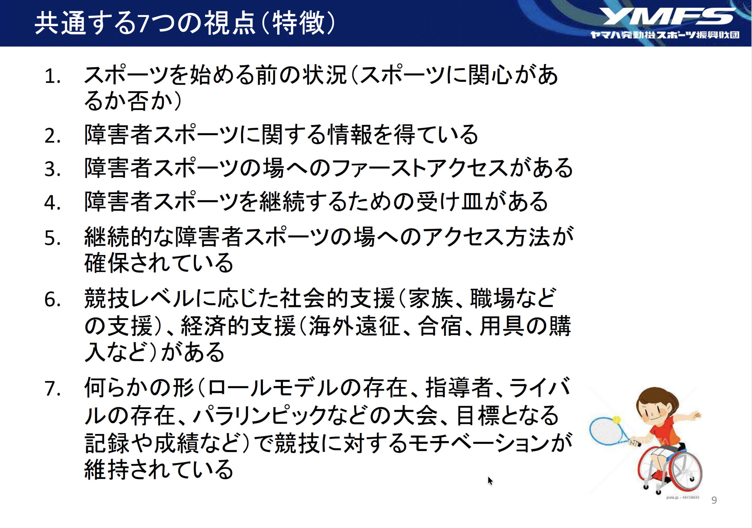 また、藤田先生方がまとめた7つの視点っていうのは、地方では漠然とわかっていて、それに向かって取り組んでいますが、可視化されていないため、感覚で進めていたところがありました。今回こうやってまとめていただいたことで、1個ずつ課題を解決していけば、障害者が居場所を作りたい、競技をしたい、パラリンピアンになりたいということにつながっていくことがわかってとてもよかったと思います。」